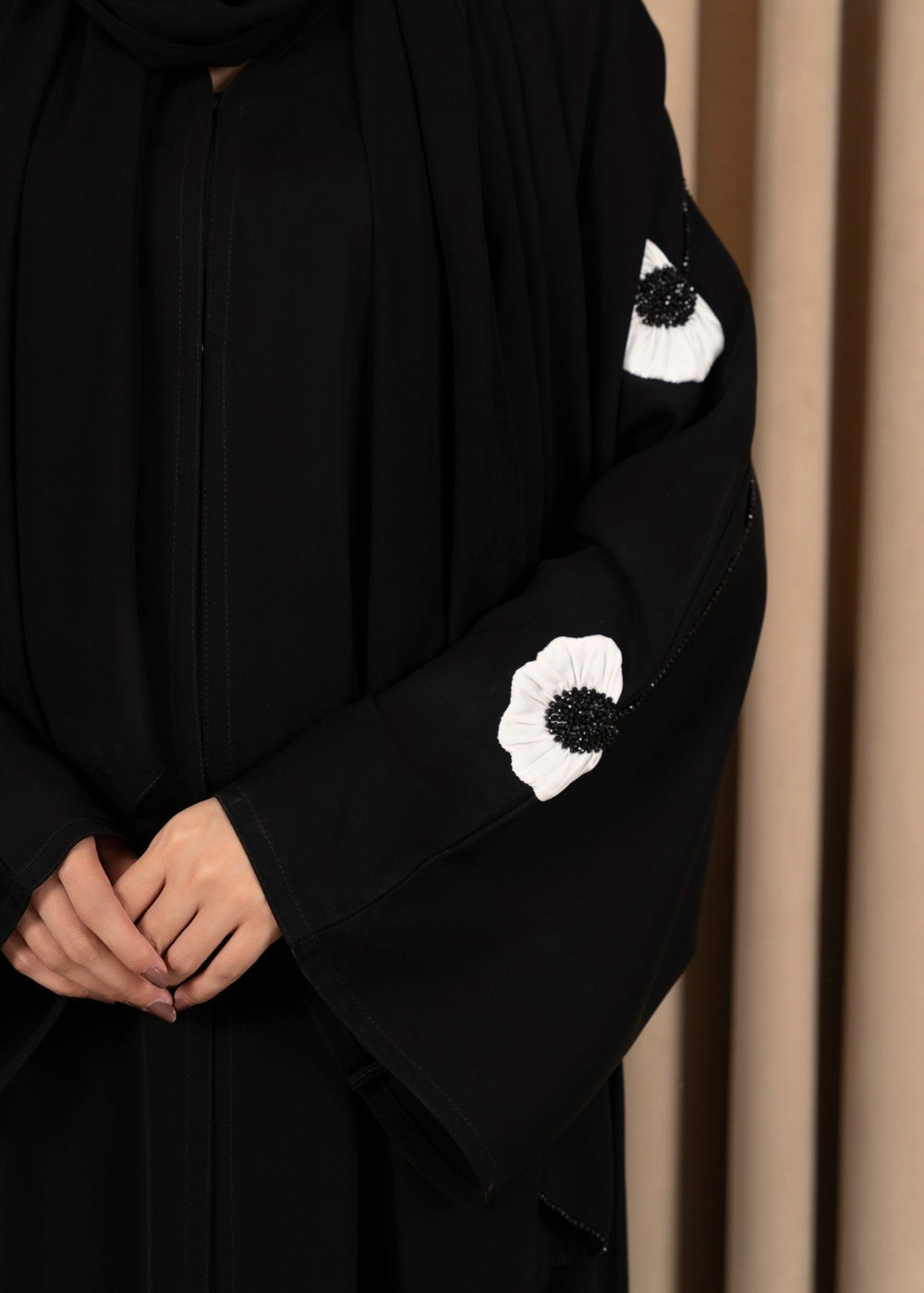 The classic black base is beautifully contrasted by an intricate white floral pattern that blooms gracefully across the fabric, creating a striking yet subtle visual appeal. Enhanced with delicate embroidery and fine beading, this abaya radiates sophistication and a whimsical charm.