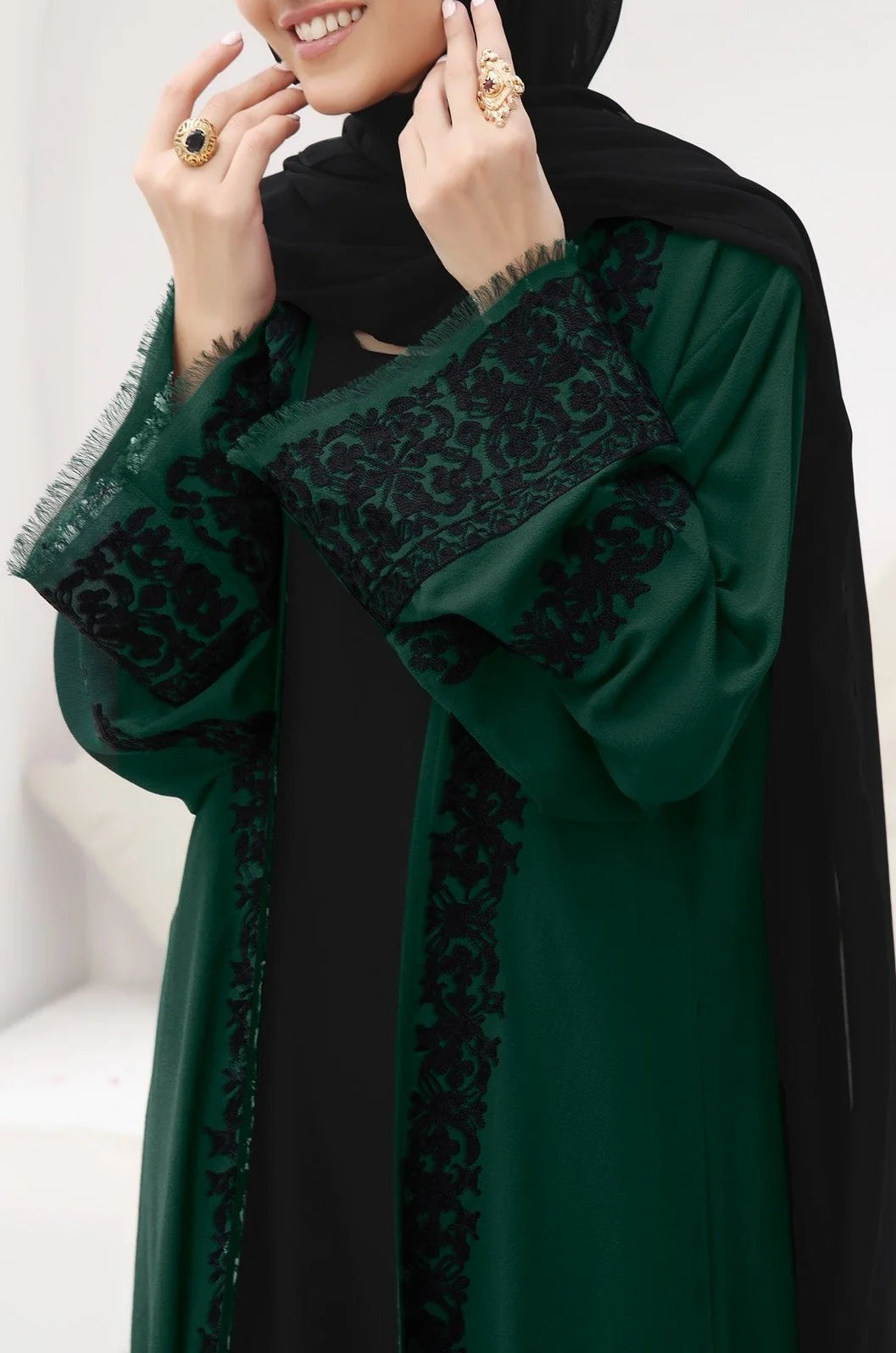 Embrace elegance with our Mystical Green Abaya featuring an inner front-open style, crafted from imported premium Nidha fabric for a luxurious feel. This stunning abaya is detailed with delicate embroidered sleeves, adding a touch of graceful artistry that makes it truly eye-catching.